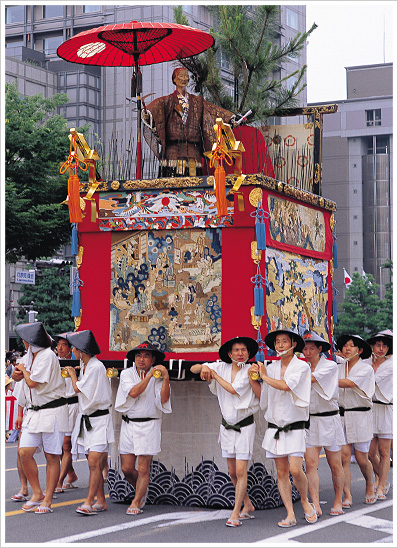 水引は日輪鳳凰文様の綴錦及び道釈人物刺繍、前懸は唐人交易図刺繍、左右の胴懸は平成11~13年に復元新調した中国故事人物図の綴織、見送は中国明代の牡丹双鳳文様綴錦である。