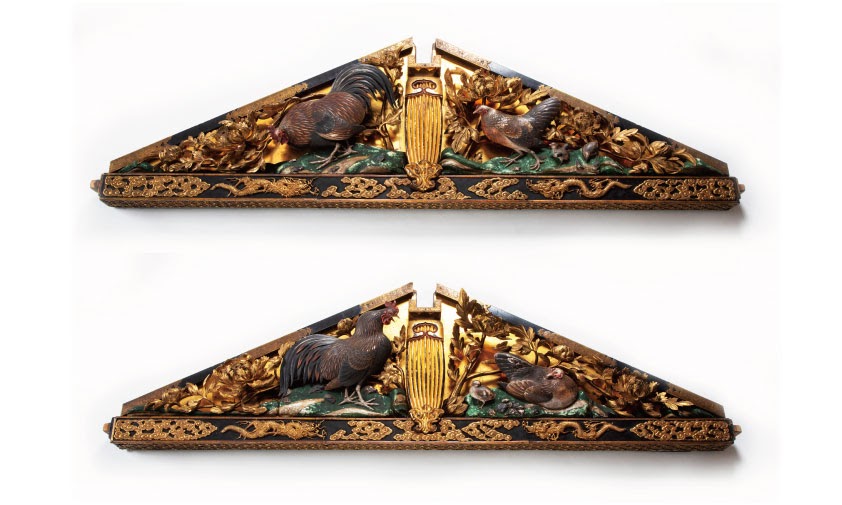 鶏鉾の前後の妻を飾る浮彫。鶏の雌雄一対を岩座上にあらわし、背景には牡丹をあらわしています。