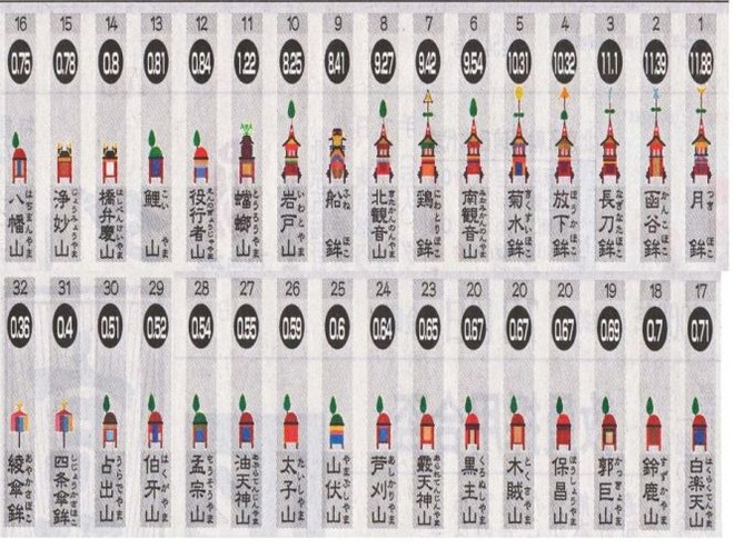 一番重いのが「月鉾」で11.88トン、最も軽いのが「綾傘鉾」の0.36トンとなった。見た目で重そうな山や鉾は、やはり重く10番目の「岩戸山」で8.2トンとなっている。